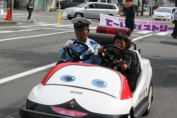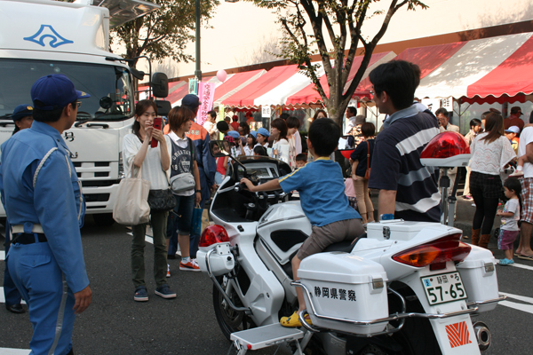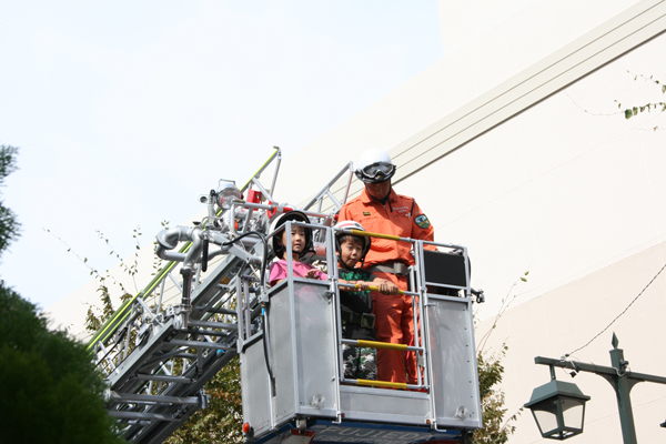 | ミニパト運転中! | ハシゴ車に乗って、緊張の一瞬。 | 起震車に乗って、地震の揺れを体験。 | 将来は機動隊! |