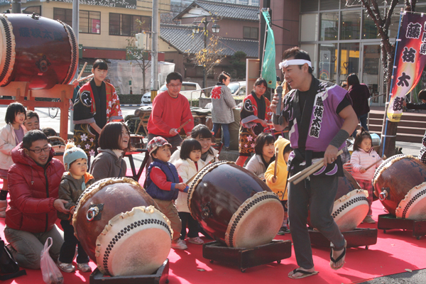 藤枝市太鼓連盟による勇壮な和太鼓演奏を堪能した後は、和太鼓を一緒に打ってみよう!