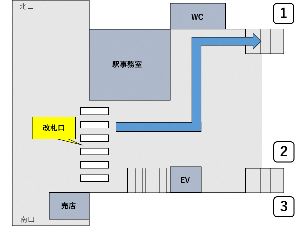 【会場図】1番線ホームへは下図1⃣の階段のみが出入口となります。